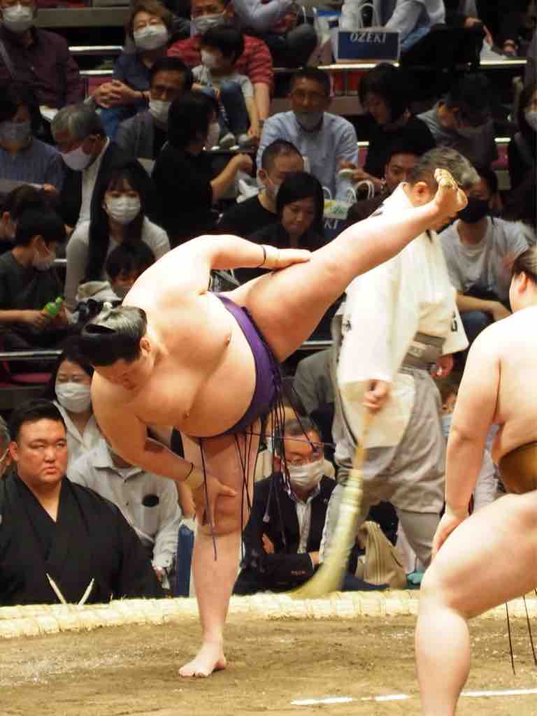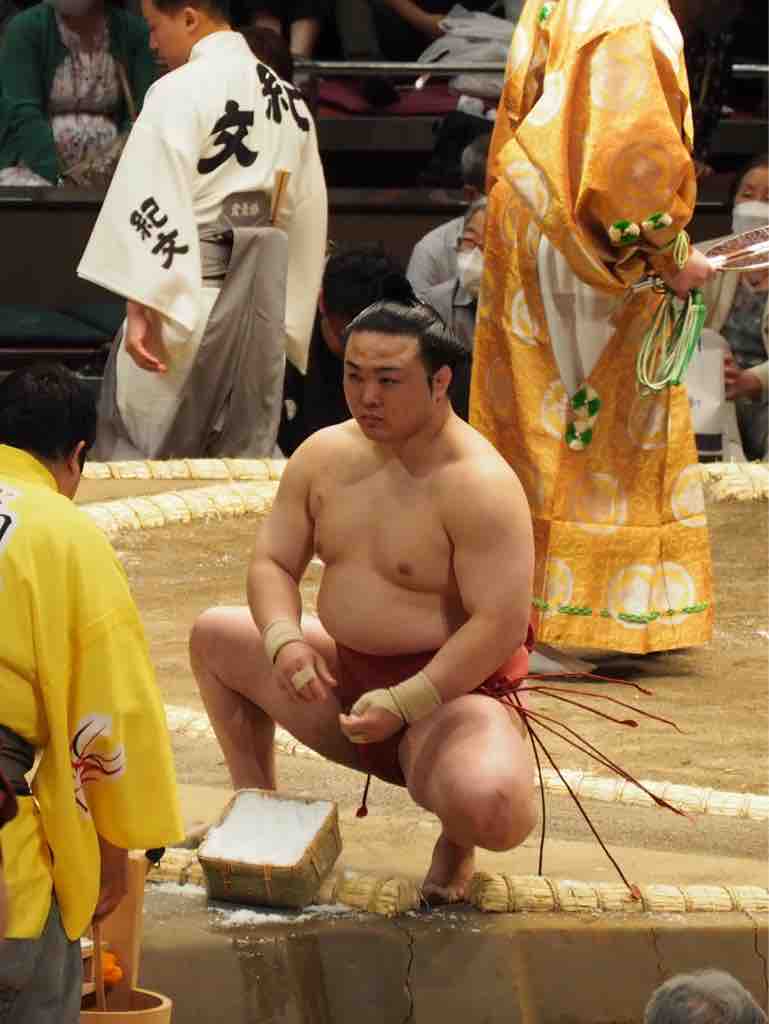 明生関。先場所は腰の怪我で大負けでしたが、今場所は四股が美しいです。少しは治ったかな…。