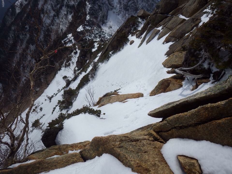 16日は雪が解けて、その上に新雪でしたが、わたしがアタックした時は雪がかなり積もったので、ピッケルとアイゼンで確保できました。17日は早朝から雨で途中から晴れて気温が上がり、雪が解けて滑りやすくなっていたと思われます。残雪期は厳冬期以上に厳しくなる場合があります。