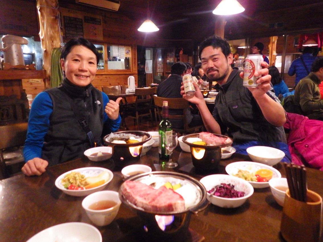 赤岳鉱泉の晩ごはんはステーキ。ご機嫌の妹と河原さん。