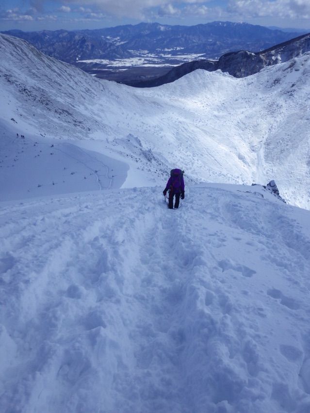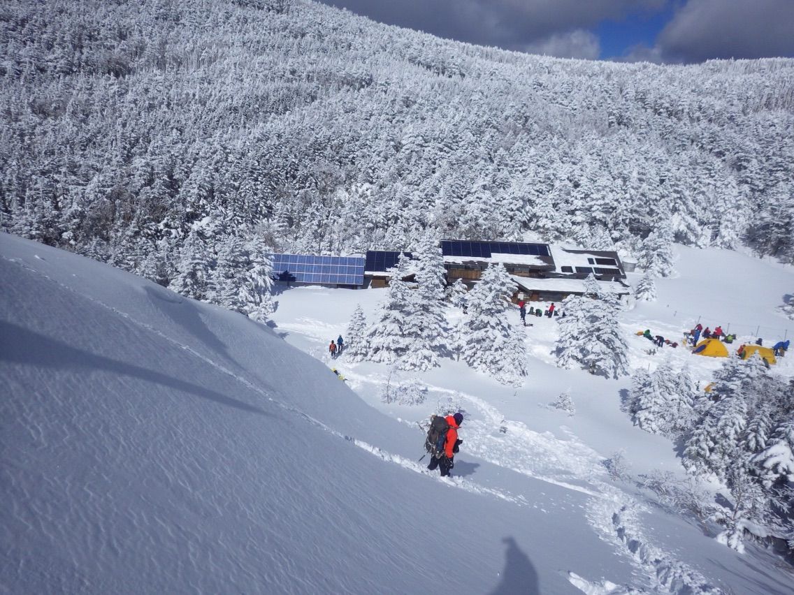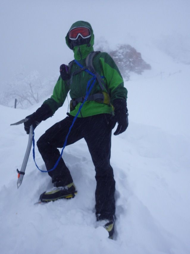一昨日から100cmの新雪。急斜面で雪崩の危険性があり、アタックを中止する。