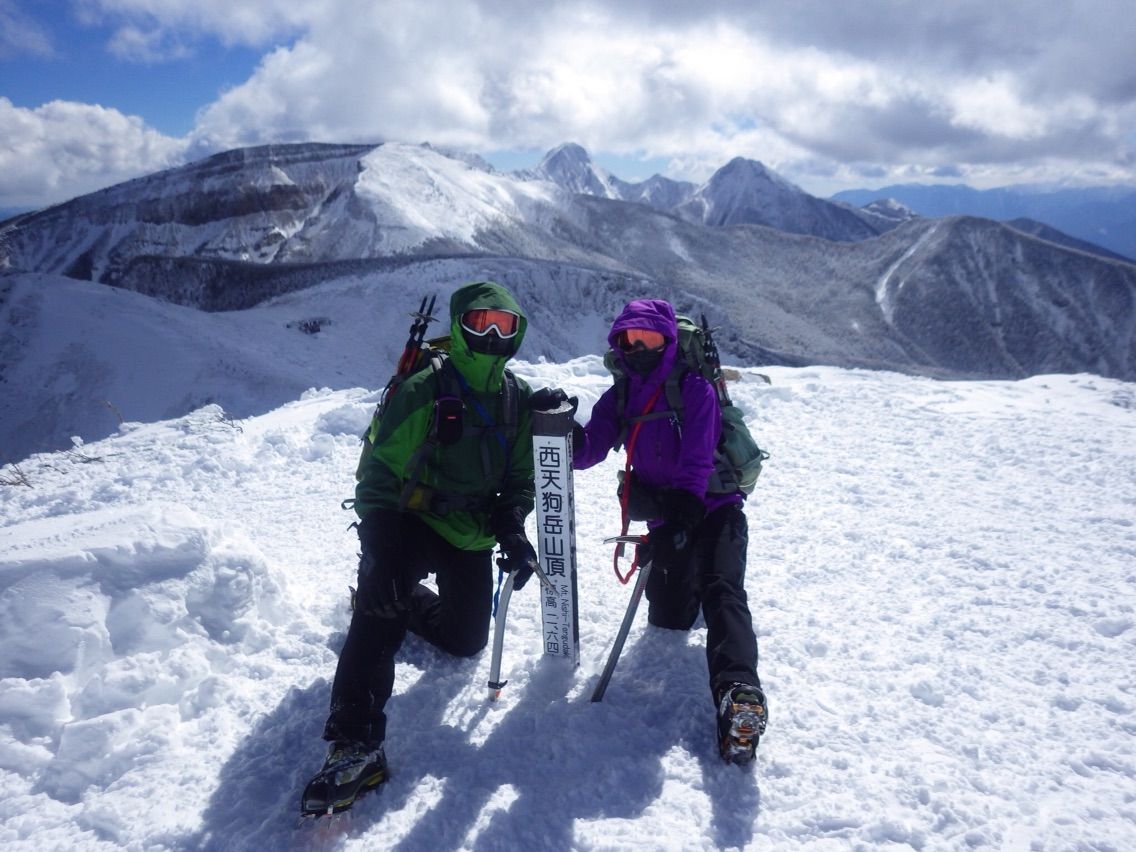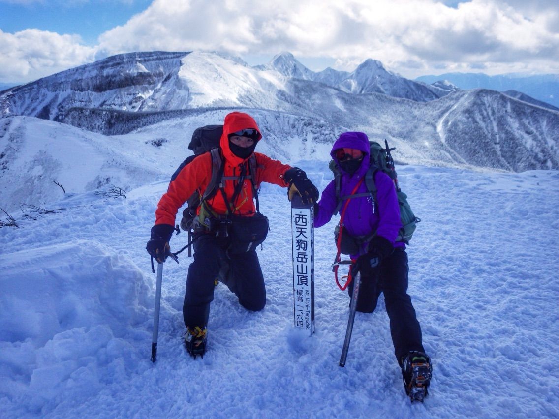 南八ヶ岳オールスターをバックに西天狗岳山頂(2,646m)で記念撮影。