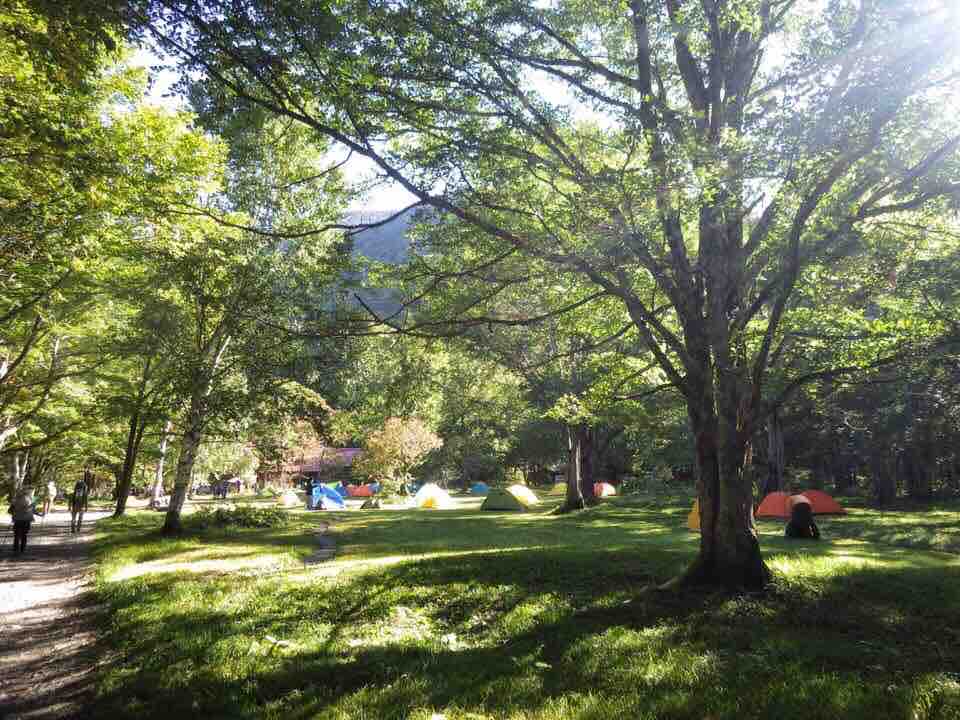 徳沢のキャンプ場。柔らかい陽射しに、爽やかな空気。最高のキャンプができますね。